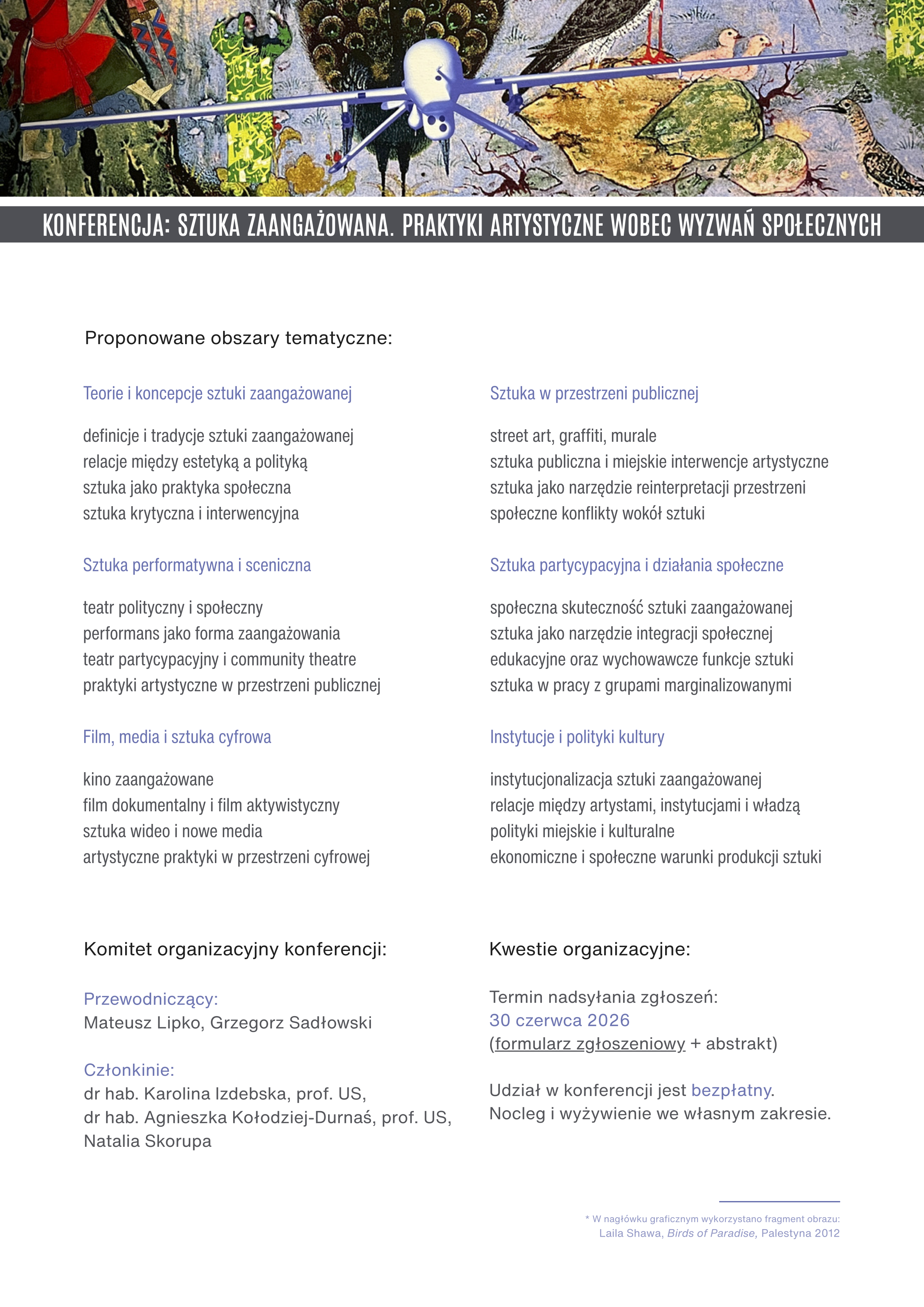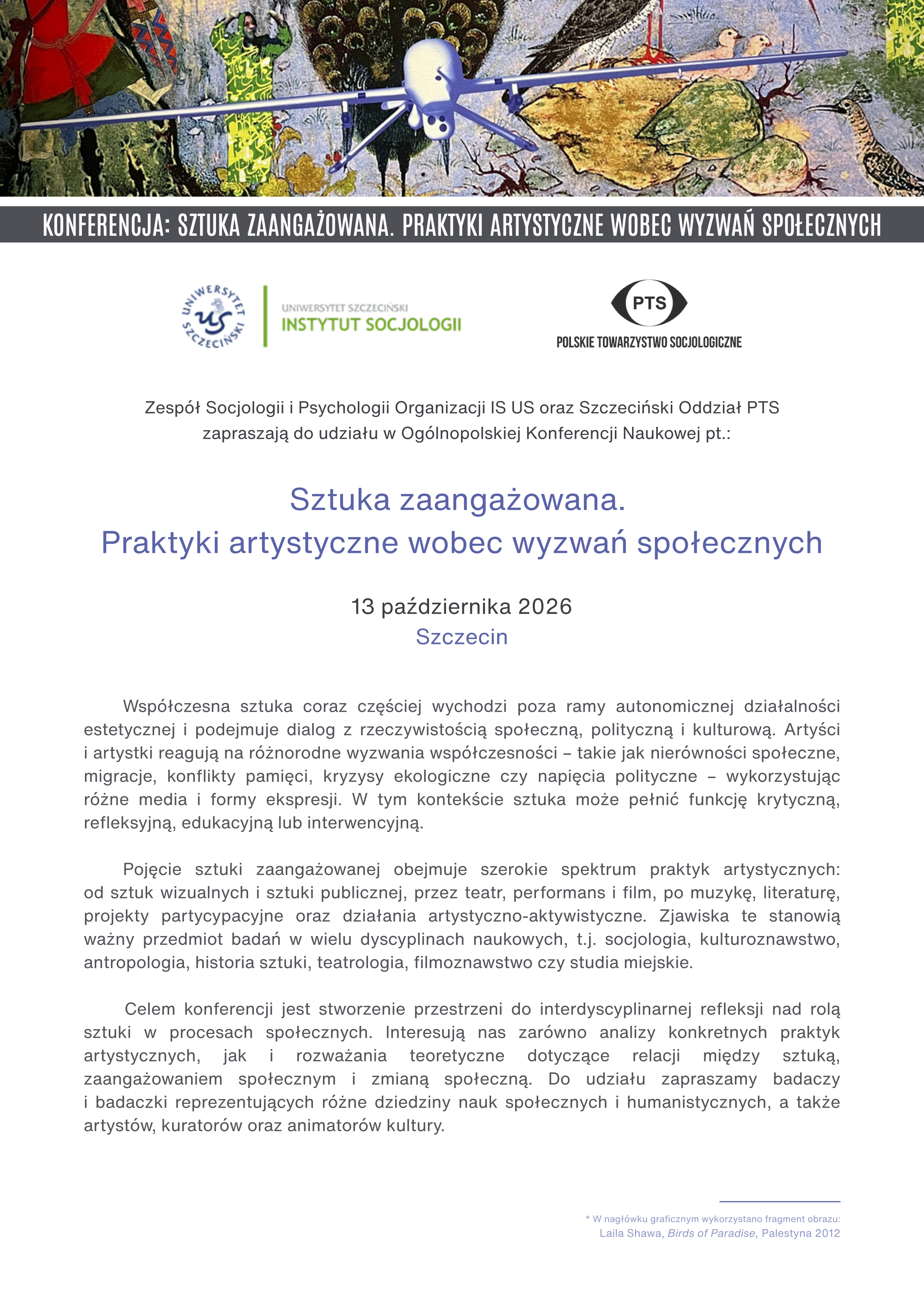 Ogólnopolska Konferencja Naukowa pt.: „Sztuka zaangażowana. Praktyki artystyczne wobec wyzwań społecznych” (Szczecin,13 października 2026)